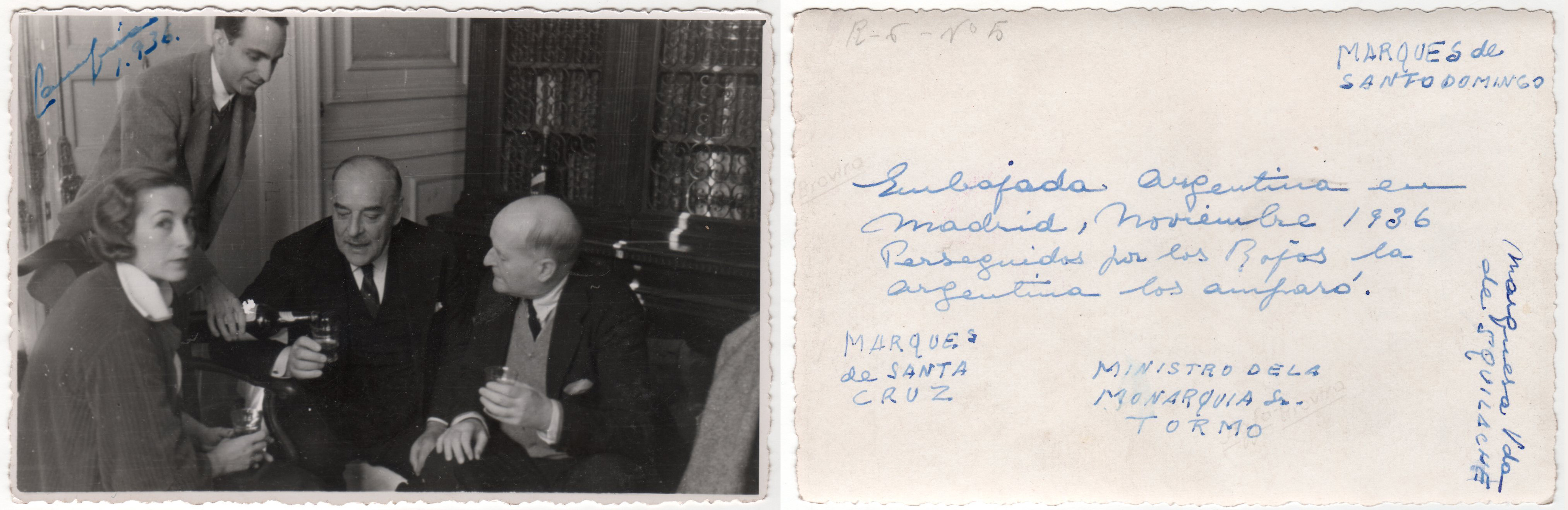 En el reverso de la imagen, el fotógrafo escribe: «Embajada Argentina en Madrid, noviembre 1936. Perseguidos por los rojos la Argentina los amparó» y los nombres del Marqués de Santa Cruz, el Ministro de la Monarquía Sr. Tormo, el Marqués de Santo Domingo y la Marquesa Viuda de Esquilache.