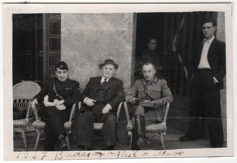 Para realizar el trabajo de reportero de guerra unas veces hacía falta disfrazarse de sindicalista de la CNT y otras vestir el uniforme falangista. En esta imagen aparece Pepe Campúa a la izquierda en Badajoz en abril o mayo de 1937