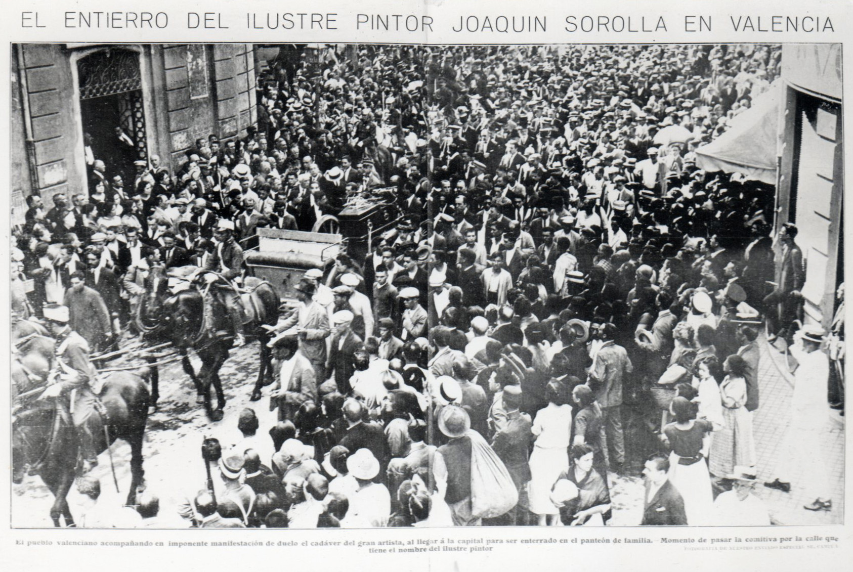 Fotografía de Pepe Campúa publicada en Mundo Gráfico de la comitiva fúnebre de Sorolla a su llegada a Valencia. El pie original dice: "El pueblo valenciano acompañando en imponente manifestación de duelo el cadáver del gran artista al llegar a la capital para ser entregado en el panteón de la familia. Momento de pasar la comitiva por la calle que tiene el nombre del ilustre pintor.