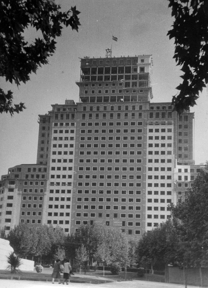El edificio España en la Plaza de España durante su construcción en los años 50