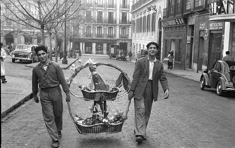 Cargando una cesta de Navidad cuesta arriba en Calle Infantas el 19 de diciembre de 1950