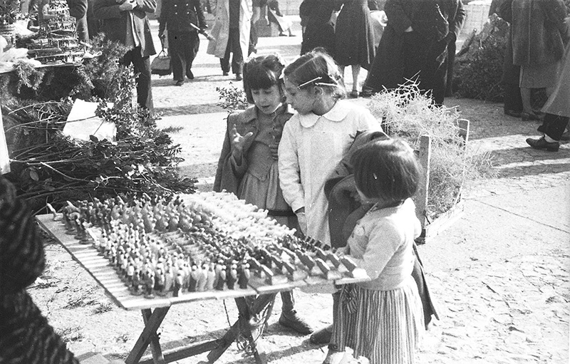 Unas niñas miran las figuritas navideñas en los puestos de Tirso de Molina, fotografiados por Pepe Campúa el 19 de diciembre de 1950