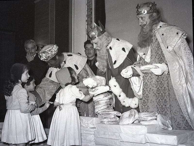 Reparto de juguetes a los hijos e hijas de los funcionarios de la Confederación Nacional de Sindicatos (CNS) en el Cine Palace el 5 de enero de 1954, fotografiados por Pepe Campúa
