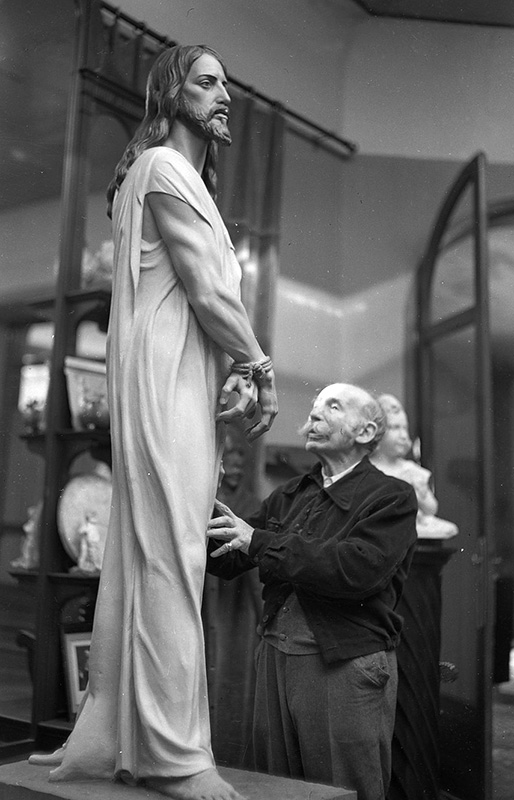 Mariano Benlliure en su estudio junto a la talla del Divino Cautivo de Madrid, retratado por Campúa en los años 40