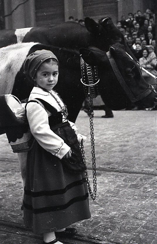 Una niña vestida de asturiana junto a una vaca lechera en el desfile de San Antón fotografiado por Campúa en 1955
