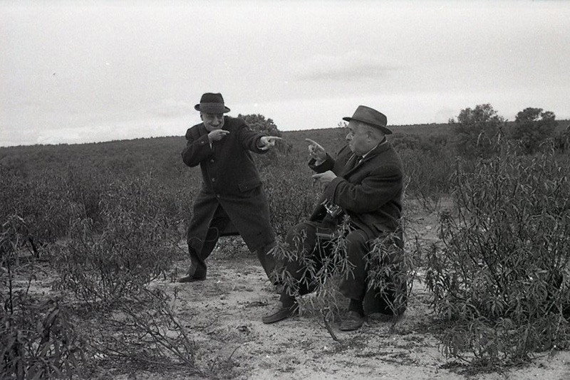 José Demaría Vázquez «Campúa» a la izquierda junto a otro fotógrafo de prensa durante una cacería en El Pardo en 1964. Los fotógrafos de prensa también tenían tiempo de ironizar sobre la actividad cinegética durante estos eventos