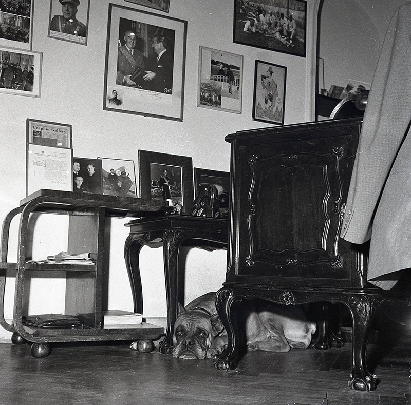 Despacho de José Demaría Vázquez «Campúa» en su estudio, con la perra Chati que le acompañaría durante muchos años