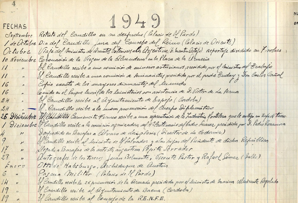 Hojas correspondientes al año 1949 en el libro de registro del estudio fotográfico de José Demaría Vázquez «Campúa». En ellas puede verse añadida al margen la anotación «Inauguración del estudio Campúa en Bárbara de Braganza, 2»