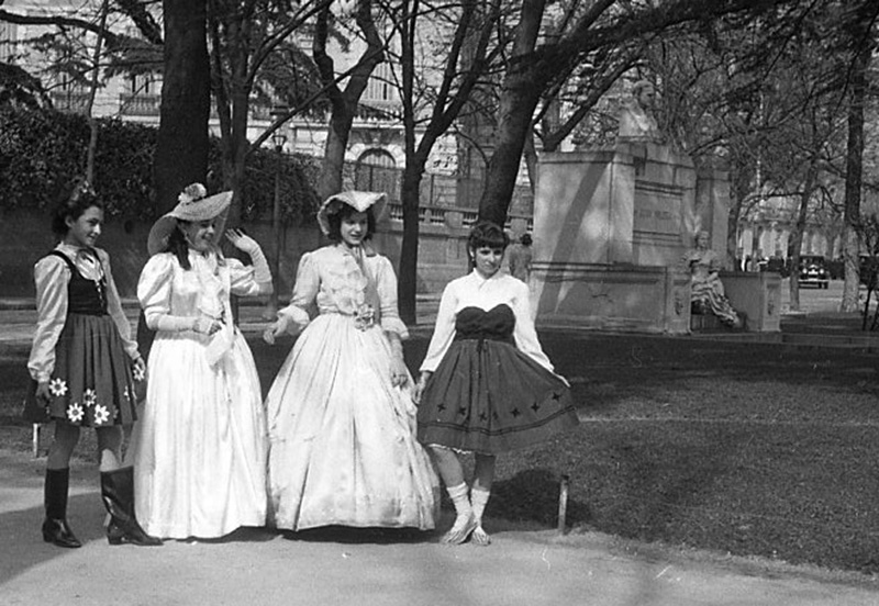Carnaval en Madrid, fotos callejeras. José Demaría Vázquez «Campúa» retrató a estas jóvenes en el Paseo de Recoletos, con el monumento a Juan Valera de fondo el 24 de febrero de 1952