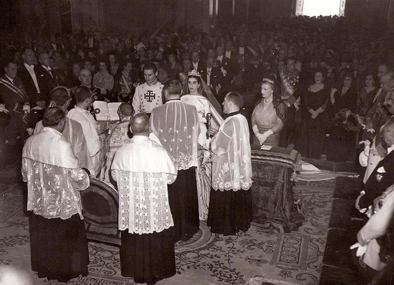 Un momento del enlace entre Desfile de los novios y los invitados en el día de la boda de Carmen Franco y el Marqués de Villaverde, captado por la cámara de Pepe Campúa