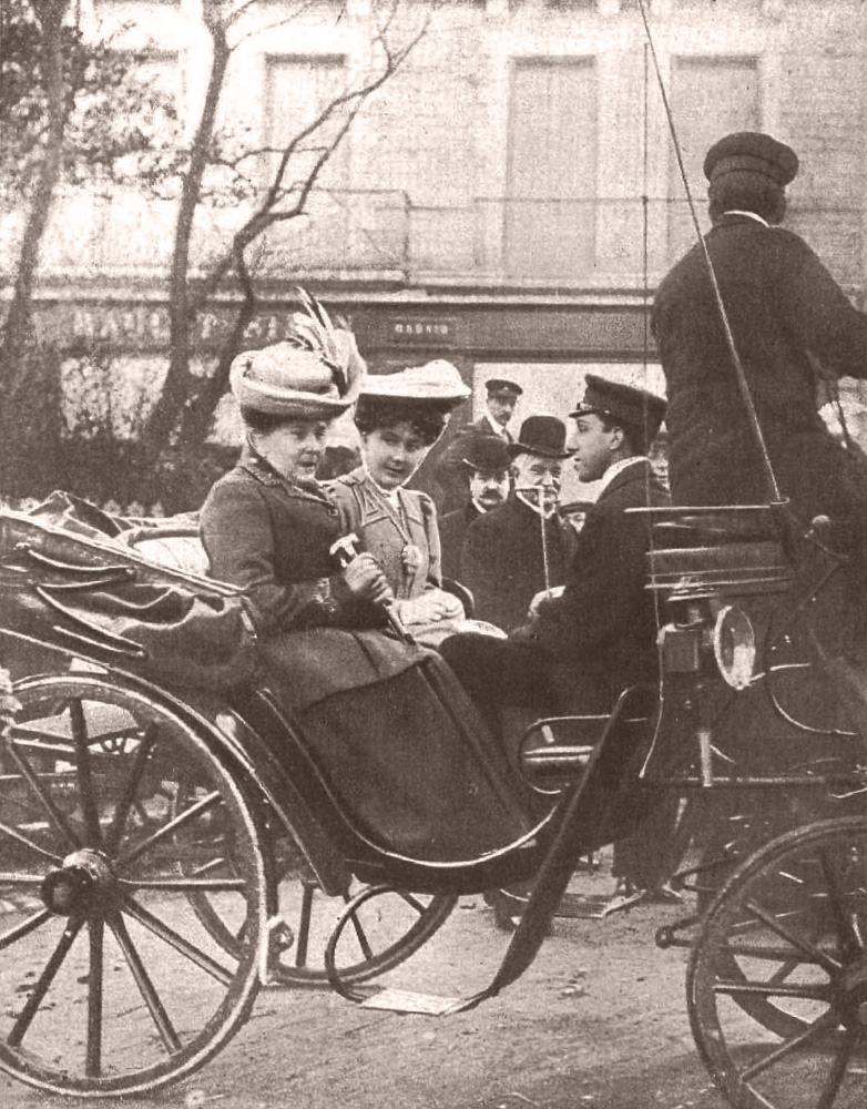 Fotografía realizada por Campúa padre (con posible fotomontaje) de Victoria Eugenia y Alfonso XIII cuando aún eran novios, paseando en carruaje por Biarriz, publicada en Nuevo Mundo el 8 de febrero de 1906