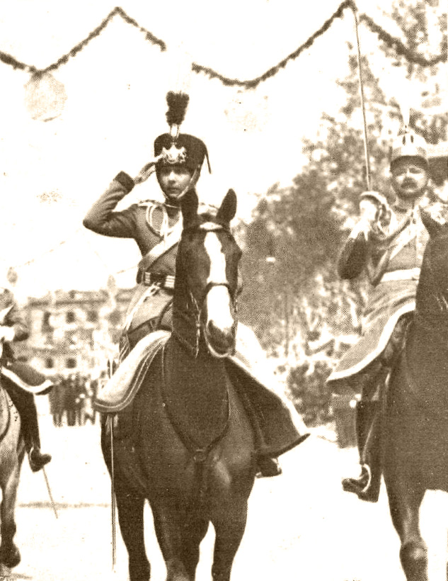 La Reina, coronel de caballería, grandiosa fiesta militar. Foto de Campúa hijo publicada el 11 de mayo de 1921 en Mundo Gráfico con el pie original: S.M. la Reina Doña Victoria Eugenia saludando el nuevo estandarte del Regimiento de su nombre, bordado por sus augustas manos y regalado a la Academia de Caballería, en la fieta militar celebrada en el Campo Grande de Valladolid el 5 del actual.