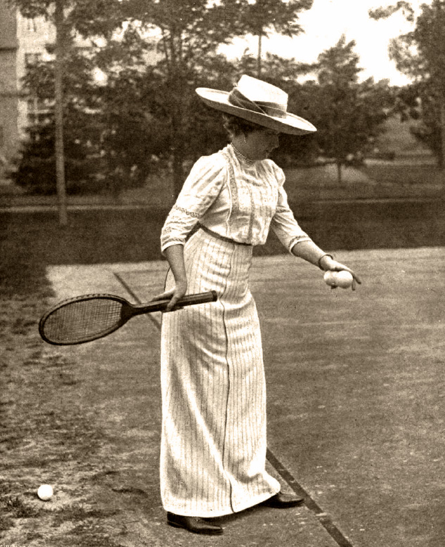 Fotografía de Campúa padre publicada en Mundo Gráfico el 9 de septiembre de 1912 con el pie: «S.M. la Reina Doña Victoria jugando al tennis en la finca de los Duques de Santo Mauro en Las Fraguas