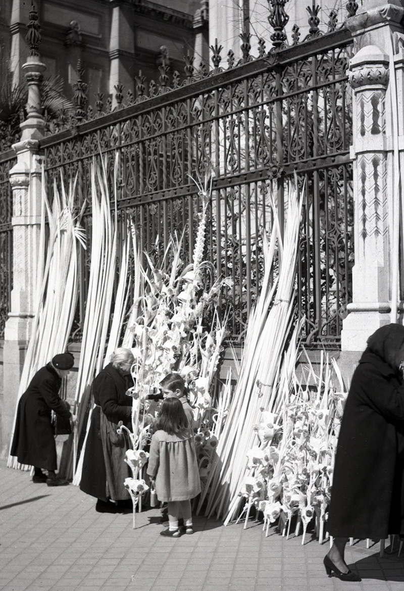 Comprando las palmas en el exterior de la Iglesia de San Manuel y San Benito en Madrid, en el domingo de ramos de 1953. Foto. Campúa