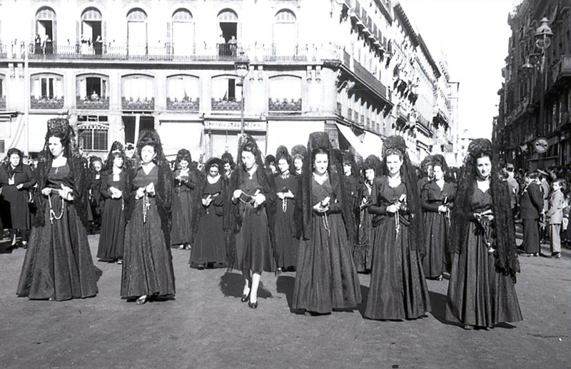 Penitentes en la procesión del Cristo de Medinaceli en Madrid, fotografiadas por Campúa en abril de 1949