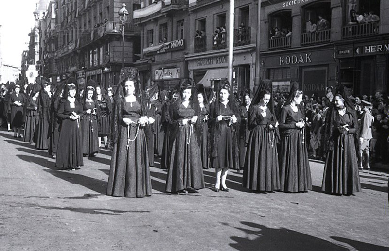 Penitentes en la procesión del Cristo de Medinaceli en Madrid, fotografiadas por Campúa en abril de 1949