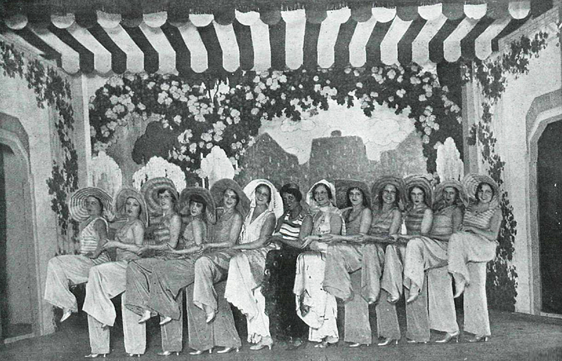 Fotografía publicada en La Esfera el 6 de diciembre de 1930. El pie original señala: El número de «Los pijamas» uno de los más sugestivos de la revista «¡Me acuesto a las ocho!» original de Vela, Campúa y el maestro Alonso, estrenada con gran éxito en el Teatro Romea.