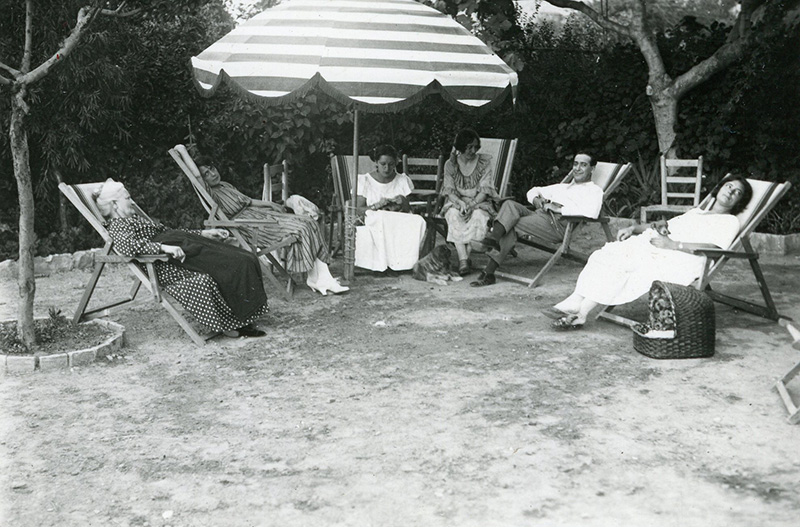 Raquel Meller en sus vacaciones en 1921. Aparece a su derecha Campúa padre sentado en una tumbona.