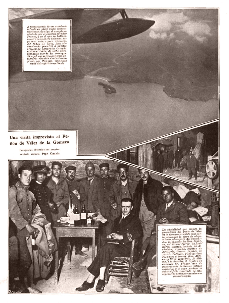 A consecuencia de un accidente sufrido en pleno vuelo sobre el territorio enemigo, el aeroplano pilotado por el capitán aviador Franco, y en el que se hallaba nuestro compañero Campúa, cayó en el mar a poca distancia del Peñón de Vélez. Esta circunstancia permitió a nuestro arriesgado camarada Campúa visitar el Peñón, de noche, aprovechando uno de los convoyes. He aquí una interesantísima fotografía obtenida desde el aeroplano, por Campúa, momentos antes del referido accidente.