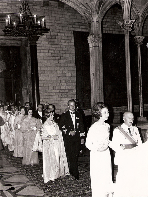 Juan Carlos del brazo de Carmen Polo en una recepción en la Diputación de Barcelona. Foto. Campúa