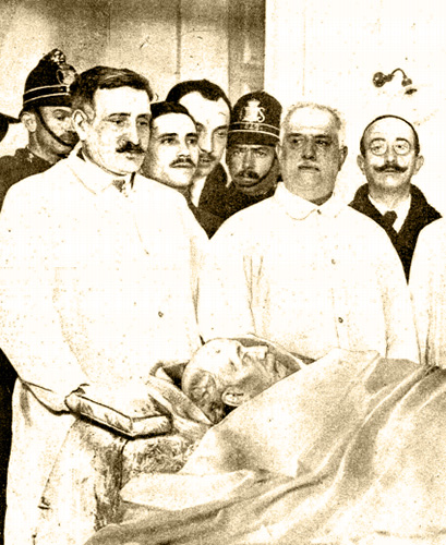 – Sí; era la época de las composiciones fotográficas, y mi director, Don Francisco Verdaguer, no se quiso perder el éxito y compuso una doble página con la foto que yo hice en la mesa de operaciones, y detrás, los médicos y el juez; y, luego, se colocó con arreglos la figura de Don Eduardo, yacente.