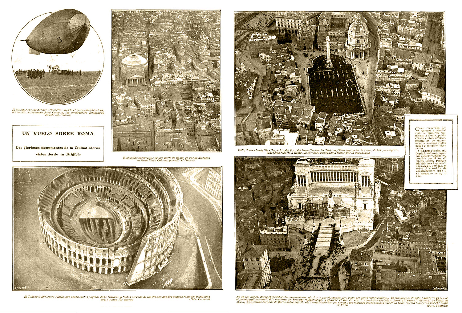 Como recuerdos del reciente y triunfal viaje de nuestros monarcas a Roma, publicamos estas diversas fotografías de monumentos romanos vistos desde el dirigible «Hesperia». Contempladas así, desde las alturas, aquellas piedras venerables doradas por el sol de tantos siglos, parecen adquirir más imponente grandeza, destacadas sobre el montón de construcciones que a su alrededor se agrupan.