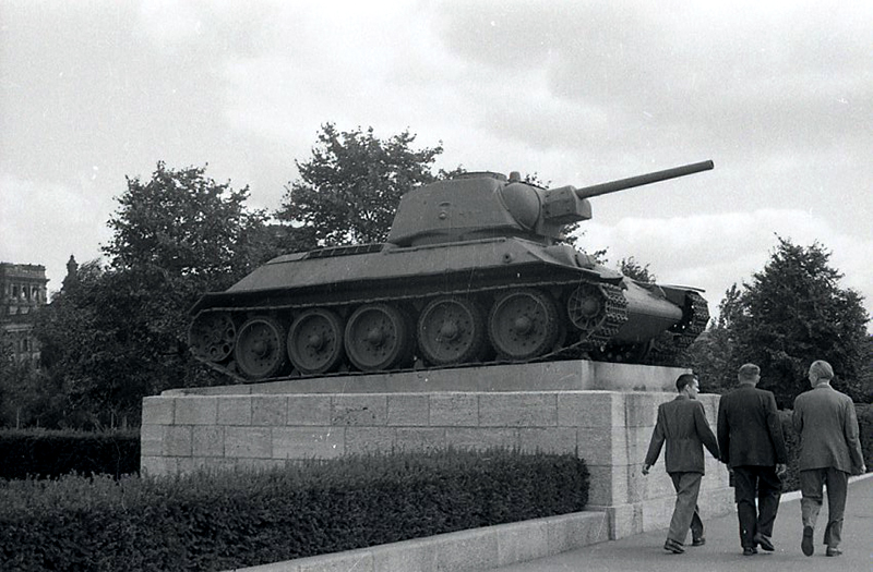Tanque junto al memorial de guerra soviético situado en el Tiergarten, fotografiado por Campúa en 1945