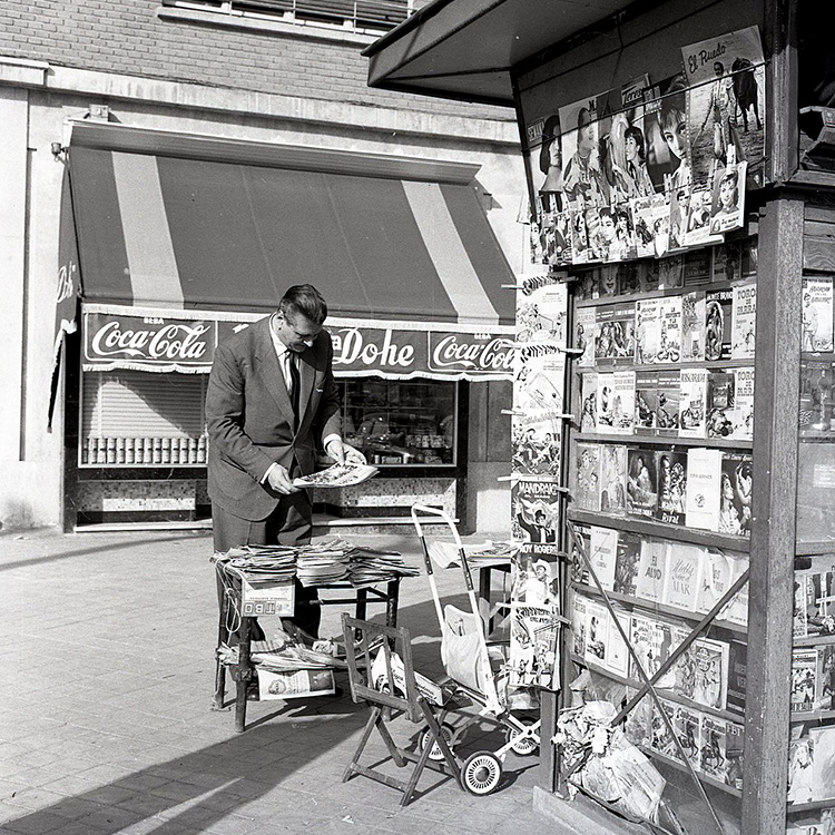 El ex coronel nazi Otto Skorzeny en un kiosko de prensa en Madrid. Foto realizada por Campúa en 1958