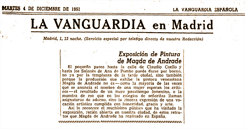 La producción que exhibe la pintora venezolana Magda Andrade no es -como la mayoría de las veces que se anuncia el nombre de una mujer esperan los críticos- el resultado de un mero pasatiempo femenino […] sino la sincera expresión de una vocación artística cumplida con honestidad, gracia y arte.