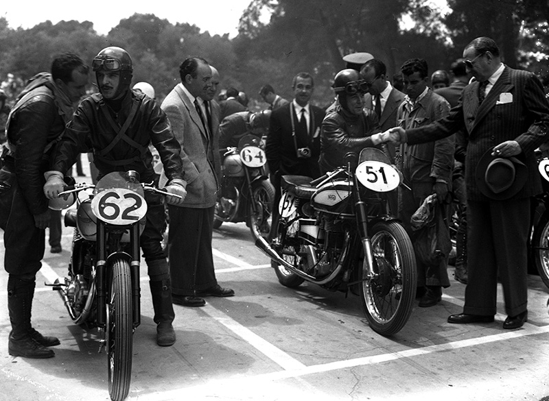 Pilotos antes de la salida de la carrera de motocicletas celebrada en el Parque de El Retiro el 14 de mayo de 1950, fotografiada por Campúa