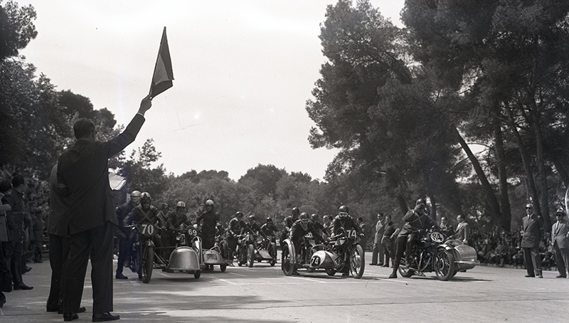 Salida de la carrera de motos con side-car celebrada en el Parque de El Retiro el 14 de mayo de 1950, fotografiada por Campúa