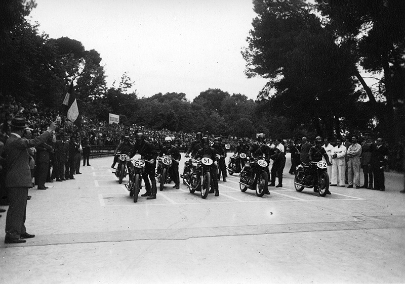 Salida de la carrera de motocicletas celebrada en el Parque de El Retiro el 14 de mayo de 1950, fotografiada por Campúa