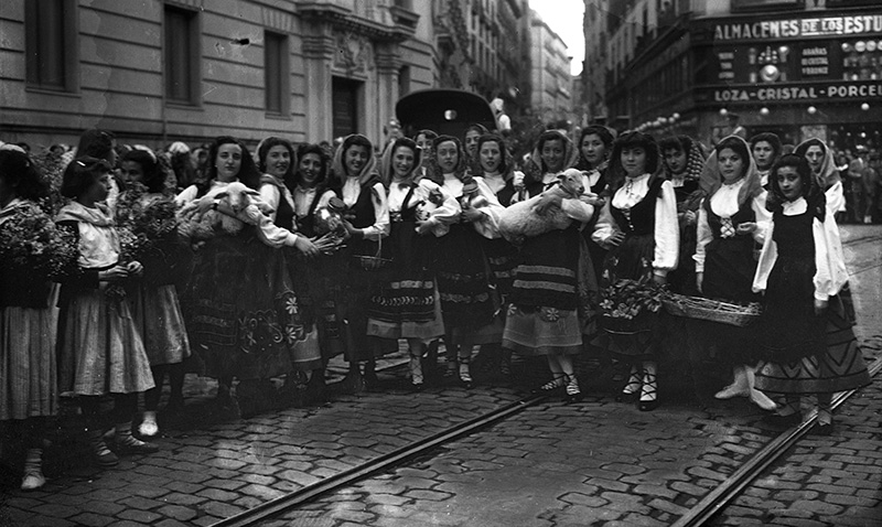 Ofrenda de frutas y animales a San Isidro en el centro de Madrid, fotografiada por Campúa en 1950