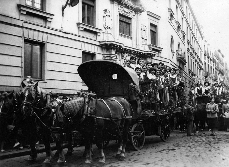 Las muchachas encargadas de la ofrenda a San Isidro llegan a la Plaza Mayor durante la celebración de 1950, fotografiadas por Campúa