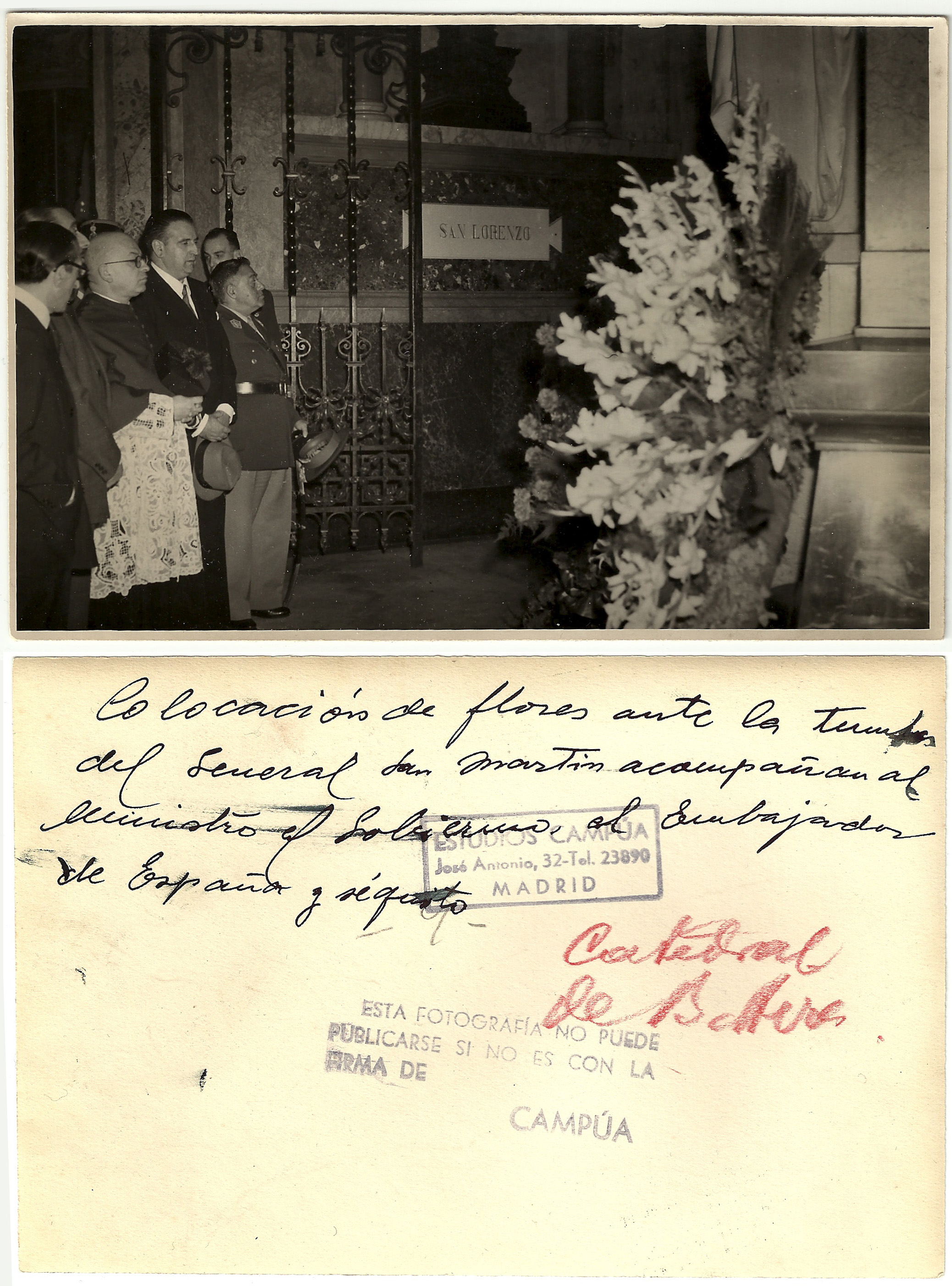 Ofrenda floral de Martín-Artajo al general San Martín en la catedral de Buenos Aires. El pie de foto original describe: «Colocación de flores ante la tumba del general San Martín. Acompañan al ministro el gobierno, el embajador de España y Séquito. Catedral de Buenos Aires.