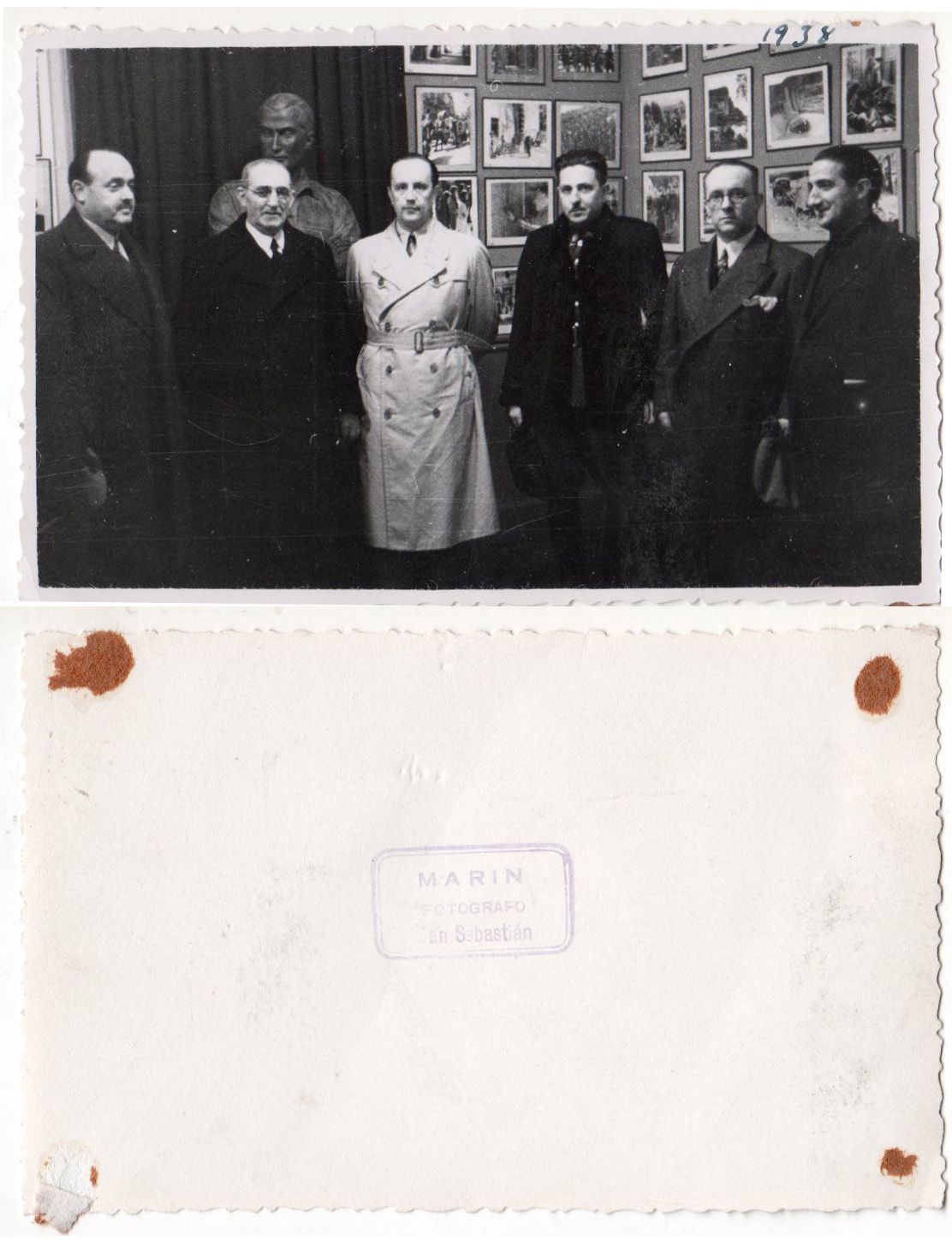 Es posible que Campúa estuviese ante el objetivo de Marín en más de una ocasión. Rescatamos hoy esta foto de grupo, tomada en San Sebastián en 1938 por el célebre fotorreportero con motivo de la exposición en la Jefatura Provincial de Propaganda de dicha ciudad de fotografías de los Frentes de la Guerra Civil española realizadas por Pepe Campúa. En el reverso de la instantánea, que Campúa guardó como recuerdo durante toda la vida, el sello de «Marín Fotógrafo San Sebastián».